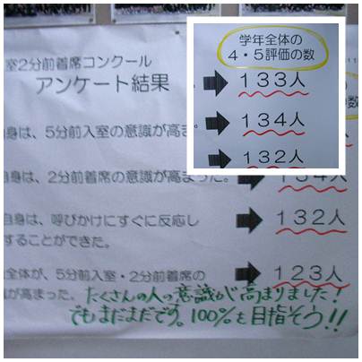 学年委員が主催した運動を受けて、時間への意識が高まっています。多くの生徒がアンケートでよくできたと答えています。このことが授業への集中につながるといいですね。テストも期待できそうです。