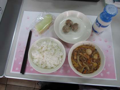 【メニュー】八宝菜 ごはん シューマイ メロン 牛乳