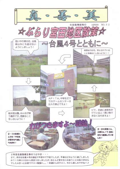 テストまで、あと5日しかありません。後悔しないようにがんばってください。1年生の皆さん、初めての9教科、いや10教科のテスト、計画的に勉強を進めてください。