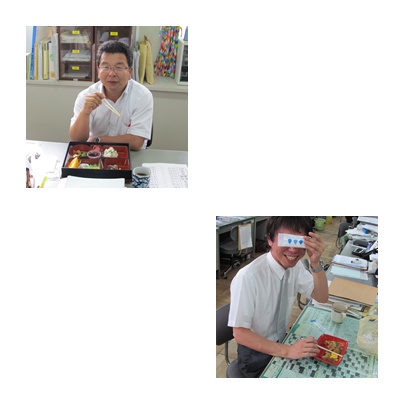 森田先生と○○先生がお弁当を食べています。幸せいっぱい腹いっぱい!