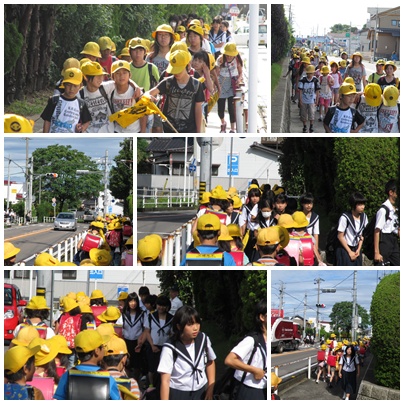 7時50分〜8時ごろの登校の様子です。みんなの歩道です。ゆずり合い、気くばりを大切に。
