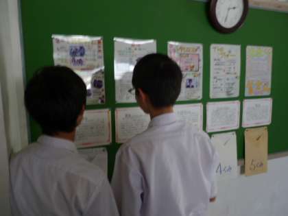 第2回学級新聞が昇降口付近に掲示され、放課になると見に来る生徒がいます。どのクラスも手の込んだ作りになっています。お気に入りのクラスの新聞に投票することになっていますが、今回票を集めるクラスははたしてどこか!?
