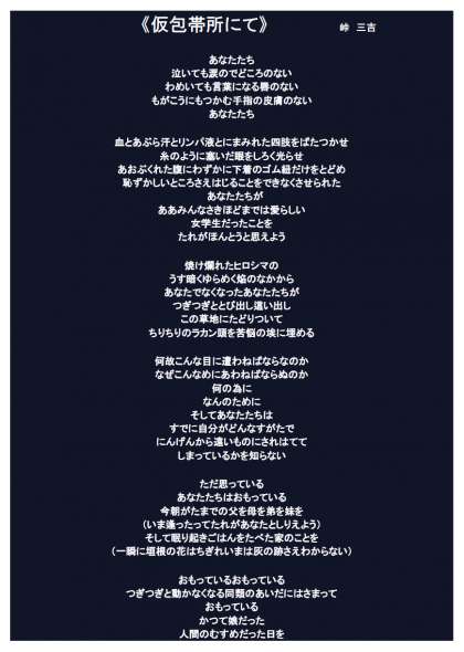 今日から学校公開週間です。南館の一階、西脱履付近に原爆パネルが掲示してあります。それを見たとき、次の詩が頭の中をよぎりましたので、載せたいと思います。