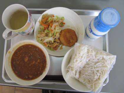 【メニュー】ソフト麺肉味噌あんかけ いももち きつねサラダ