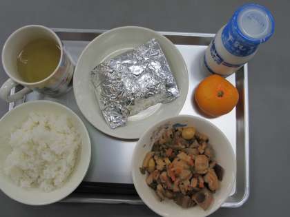 【メニュー】鯖の銀紙焼き こんさいのふきよせ煮 みかん