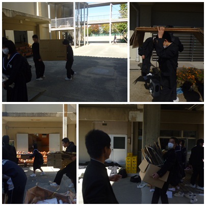 本日の午後の資源回収に先立って、学校のリサイクル室に大量にたまっていた「資源」を外に出し、キューブに入れる作業を行いました。多くの生徒が手伝ってくれて助かりました!ありがとう!!