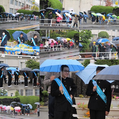 今朝のあいさつ運動は水泳部でした。今まで雨の日は脱履での活動でしたが、水泳部はがんばって外で活動していました。ご苦労様でした。