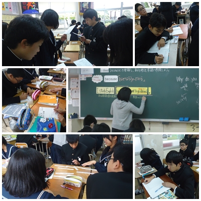 3限に英語科田中先生による研究授業が2−2で行われました。「because」を用いた表現を、グループ活動を取り入れながら、練習することができました☆