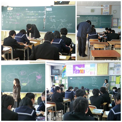 数学や英語、家庭科の授業の様子です。先生の説明を聞いたり、プリントに取り組んだりしています。