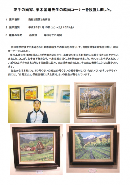 栗木基晴先生から絵画19点をお借りして、本校の第2美術室に展示させてもらいました。先生は、長野の山が大好きで、山ばかり描いておみえです。理由を尋ねたところ、次のように答えていただけました。