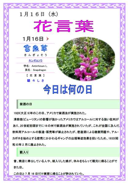今日の花言葉と花の写真、今日は何の日を載せます。