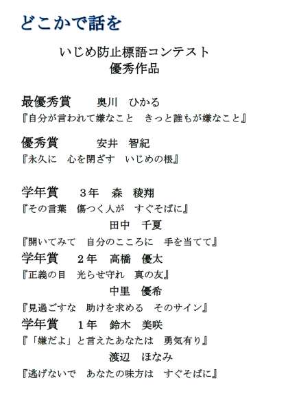 本校のいじめ防止標語コンテストの上位作品です。一度、読んでみてください。