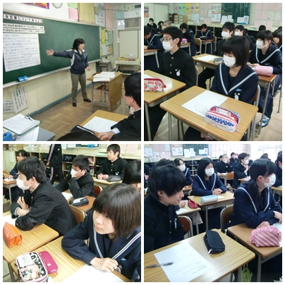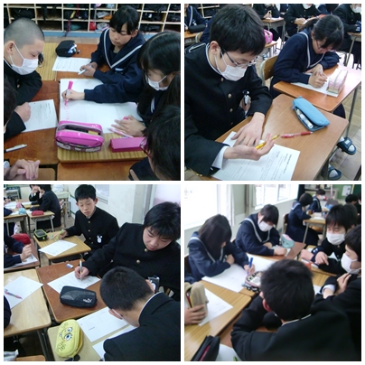 1時間目の学活に、担任と養護教諭の二人で男女交際についての授業をしました。2−1以外のクラスもすでに学習をしています。中学生の男女交際について、個人でしっかりと考え、その後班や学級全体で意見の交流をしました。授業の終わりには、動物によって、脳のつくりが違うということ、思春期の男子と女子は、異性に対しての欲求に差があるということを学びました。お互いを尊重し合える関係を築きたいですね。