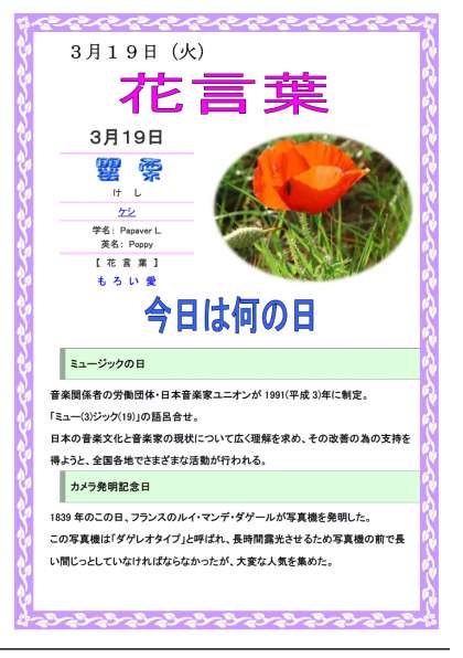 今日の花言葉と花の写真、今日は何の日を載せます。