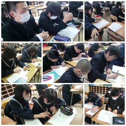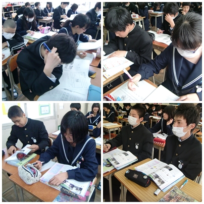 3時間目の授業の様子です。英語では、プリントを使って2年生の復習をひたすらやっていました。全員が授業に参加して、一生懸命問題を解いている姿は素晴らしかったです。この調子だ、2年生!!