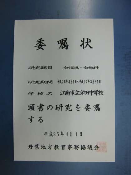 丹葉校長会において研究委嘱状を授かりました。研究題目は全領域・全教科で研究期間は平成25年4月1日〜平成27年3月31日です。