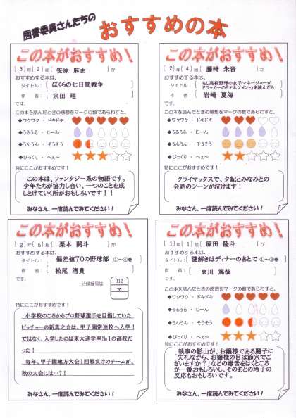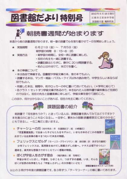 6月21日(金)から、朝読書が始まります。修学旅行の関係で、3年生は6回、1・2年生は10回の機会があります。時間としては、2時間〜3時間で読める本がベストだと思います。そろそろ準備をして下さいね。