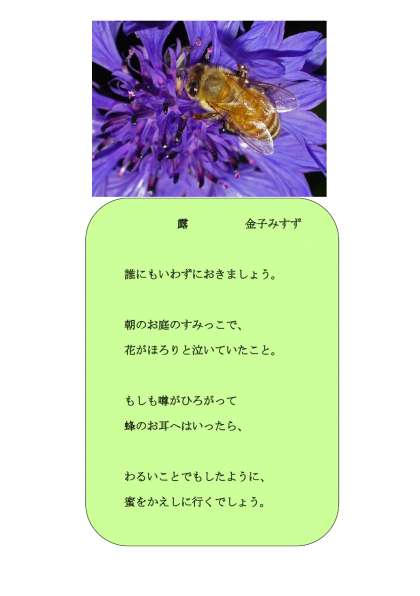 胸のいたみ、誰にも相談できぬこと、一人ひとりもっているのではないでしょうか。そんなときの舞台づくりのみすゞさんの上手なこと。この花も、すみっこに咲いている花を主人公にして、美しくもせつない思いですね。