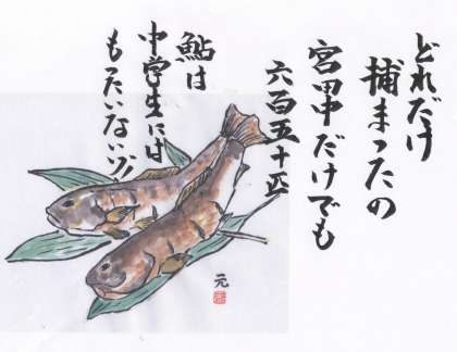 鮎の甘露煮(かんろに)が給食にでました。頭からぱくりです。とてもおいしかったです。中学校でもちなみに一人1匹ですから誤解のないようにお願いします!イラスト上2匹なんです!