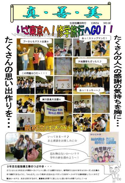 3年生が修学旅行に出かけています。今頃、各班に分かれて、アンテナショップに訪問しているところでしょうか?
