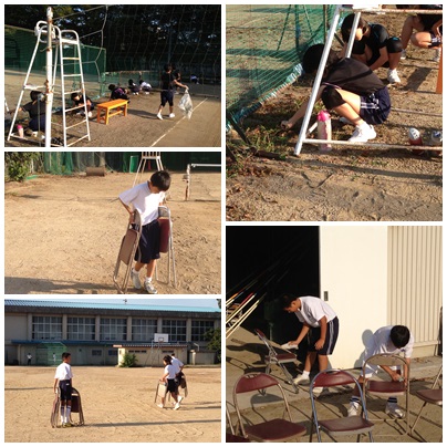 土曜日に行われる体育大会に向けて、女子バレーボール部はグランドの草抜きを行い、サッカー部、女子テニス部は器具庫から椅子を出し、水拭きをしました。