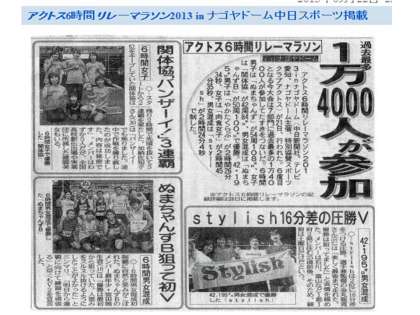 ぬまちゃんずがアクトス6時間リレーマラソン2013 IN ナゴヤドームで男子6時間の部で「ぬまちゃんず」が連覇し、男女混成の部でもぬまちゃんずBが初優勝をとげました。おめでとうございます!