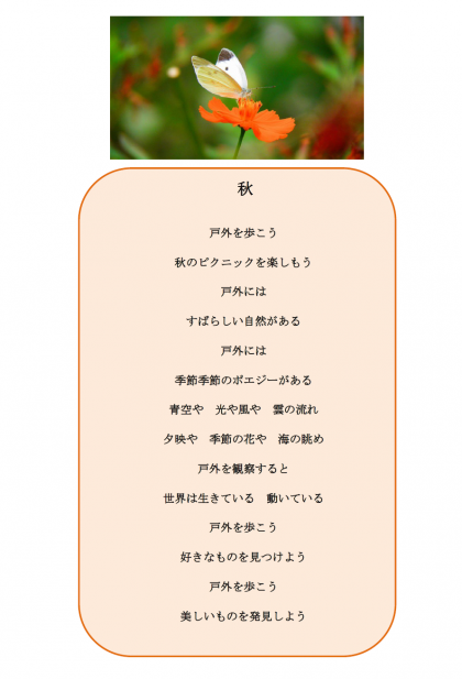 北海道の各地では、初雪・初氷を観測したそうです。台風が過ぎ、一歩秋が進んだようです。今のうちに、戸外へ出て、自然にふれましょう。