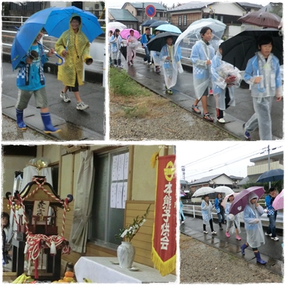 その帰り道、降りしきる雨の中を、祭りの一団が練り歩いていました。