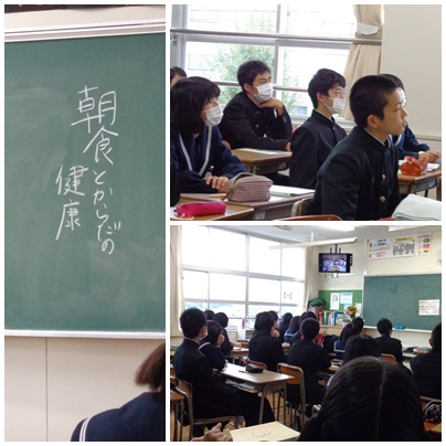 今朝の「健康の日」の取組は、「朝食と体の健康」をテーマにDVDを観て学びました。