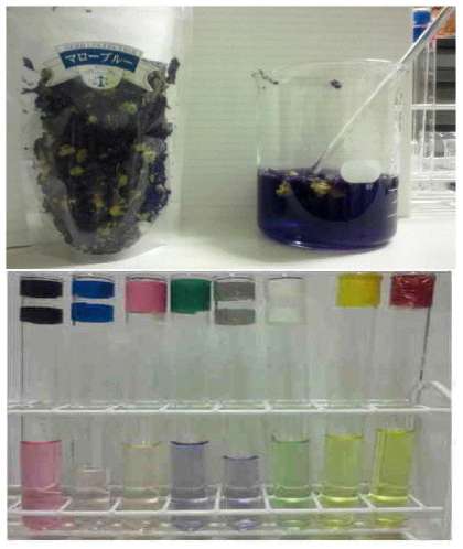 マロウという花の色の成分が、酸性・中性・アルカリ性の水溶液に触れると、きれいな色に変わります!