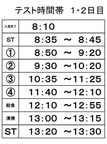 今日から、3日間期末テストがあります。今日と明日の時間帯を載せます。帰りの会終了は、13時30分を予定しています。