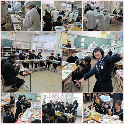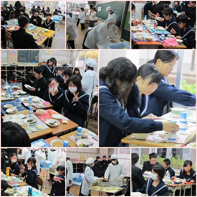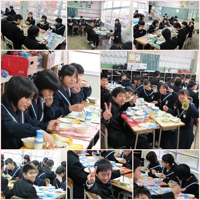 1・2年生の給食準備、会食の様子です。テストの初日が終了、ほっとした気持ちで、明るい雰囲気で食事を楽しんでいました。