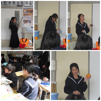 1年2組社会ではアメリカの農産物についての発表が行われました。聞くこどもたちの様子もうなずきが増えてきましたね。中村さんは実際のアメリカの肉やオレンジを持ってきてみんなにみせてくれました。