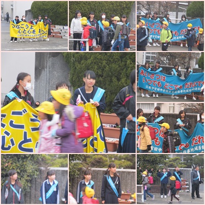今朝のあいさつ運動は、ソフトテニス部でした。みんな、ニコニコしながらあいさつができていました。寒い中、ご苦労様でした。