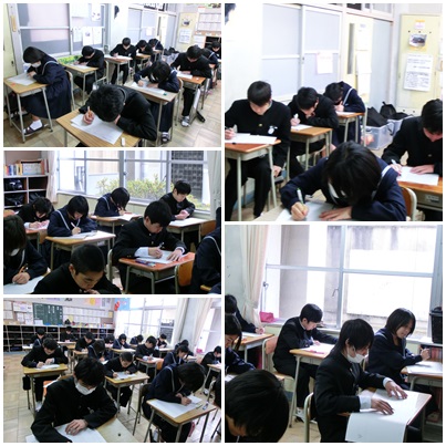 数学の授業では一つの単元が終わったので、テストをおこなっています。テスト前の時間では、1学期や2学期とは違い、多くの生徒が最後の確認をしていました。どんな場合でも、あきらめずに取り組みたいですね。