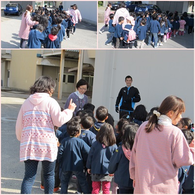 10時ごろ、宮田南保育園の園児のみなさんが、学校に来てくれました。宮田中学校が避難時の第3避難所ということで、経路確認を兼ねて訪問してくれました。笑顔いっぱいの皆さんに会えて、明るい気持ちになりました。