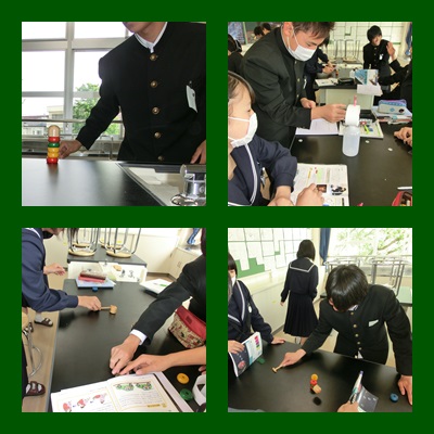 慣性の法則の内容です。だるま落としや、輪っかのうえに乗ったキャップを、素早く輪っかを抜いて、下のびんにの中に落とすことをしました。