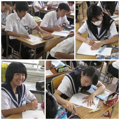 5時間目の授業の様子です。みんなとっても眠そうだけど、しっかり勉強できています。美術の大竹先生の授業は平面構成のアイデアスケッチです。写真の宮本さんは大竹先生に質問しクラスを和やかな雰囲気にしていました。2学期の出来上がりを期待しています。