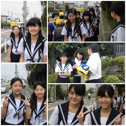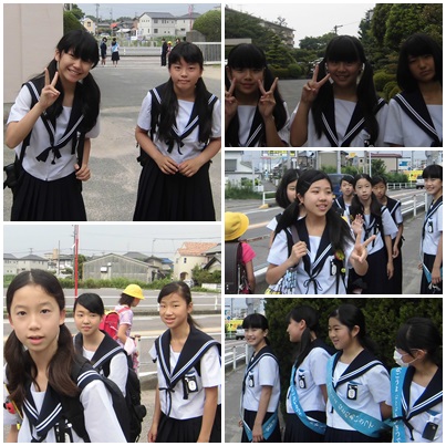 小学生も中学生もみんな入り交じり銀座通り、あいさつは忘れるな!