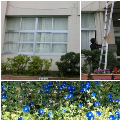 校務主任の佐野先生が、南館の応接室・校長室前に、緑のカーテンに向けたネットを設置してくれました。