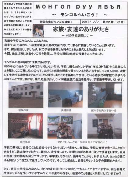 青年海外協力隊員としてモンゴルに赴任されている岩田先生から、モンゴル通信22号が届きました。海外で様々な経験を積まれているようですね。まさにグローバル化の時代です。