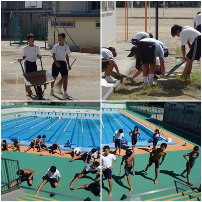 今日は、練習の前にプール周辺の草を抜いたり、苅ってある草を集めて、きれいにしました。1時間近くかかりましたが、とてもきれいになりました。水泳部のみなさん、ありがとうございました。