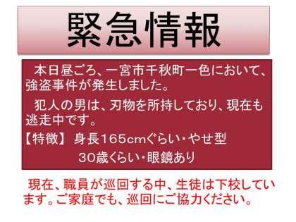 緊急情報については、全校生徒に注意を呼びかけました。くれぐれも気をつけて下校しましょう。