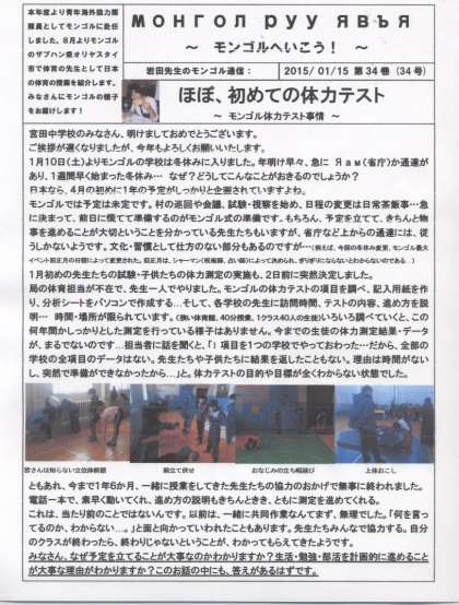 青年海外協力隊としてモンゴルに赴任されている岩田先生からモンゴル通信第34号が届きました。