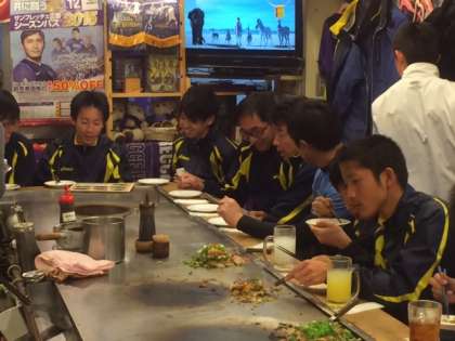 写真は開会式前の選手の笑顔と、愛知の選手がサインを求められている様子と、昼食でお好み焼きを食べている様子です。
