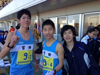 1区、内田君が一位で帰ってきて、二区小澤君も一位でつないでいます!女子は三位でつないでいます!