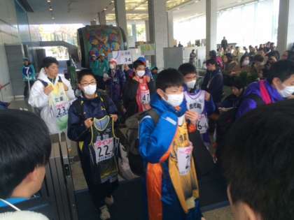選手が平和記念公園で招集を終え、華やかに選手紹介をうけた後、各中継所にバス移動をします。2区の蝦夷森くんから7区の神野くんまでの招集が済みました。ものすごい人だかりで、駅伝人気の高さがうかがえます。
