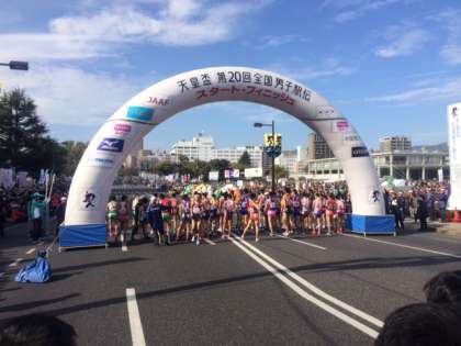 スタートしました。1区の選手も尾張出身です。とても落ち着いており、よい集中力でスタートラインに立てていました。