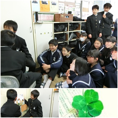 1年6組を覗いてみると二人の男の子が本の読み聞かせをしていました。そこに多くの生徒が座って聞いており、すごくクラスの良い感じが伝わってきました。もちろん輪の中には小川先生もみえました。素直さが輪になったような気がしてクラスを出ました。