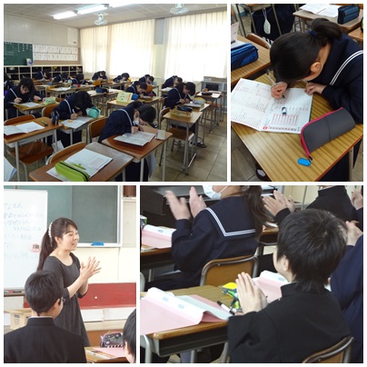 5組は岩本先生による音楽の授業。拍手も立派な音楽であり、正しい拍手のやり方を指導されていました。いい音を出すには手のひらを少しずらして叩くと良いらしいです。奥が深い!